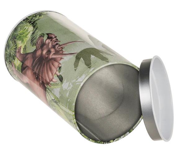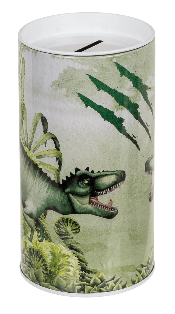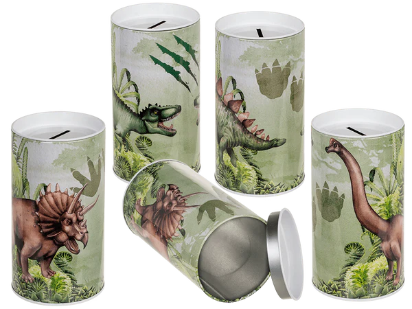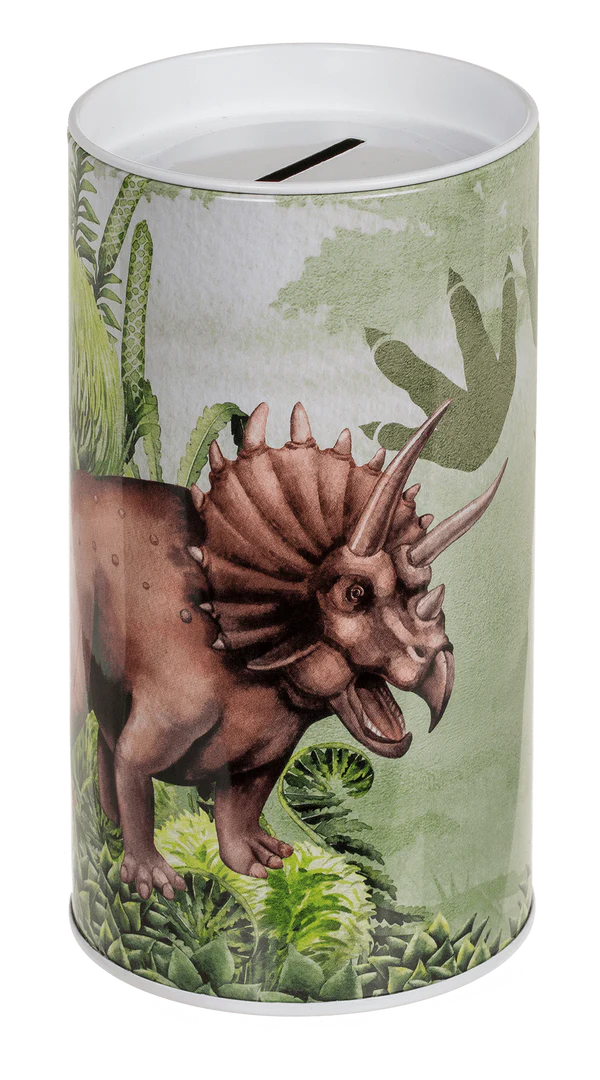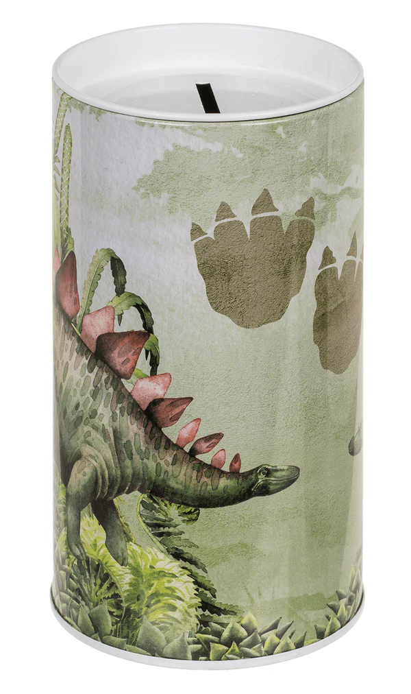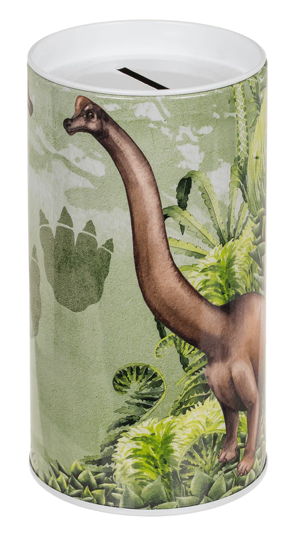 Tato pokladnička je jednoduchý, ale velmi půvabný předmět, který spojuje funkci učení spoření s fascinací dětí světem dinosaurů. Je vyrobena z kovu, je lehká a praktická a okamžitě zaujme výraznou grafikou a přátelským prehistorickým motivem.