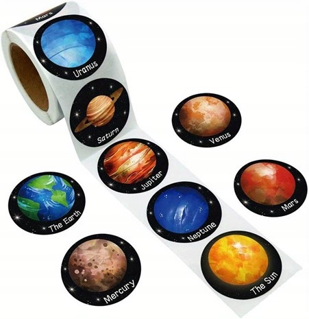 Die Rolle enthält bis zu 500 Sticker, so dass sie für wochenlanges Spielen, Unterricht, Klassenfahrten oder Familienaktivitäten ausreichen. Dank ihrer kompakten Form lassen sie sich leicht in einer Schublade, einem Federmäppchen, einer Aktentasche oder einem Schulranzen verstauen. Jeder Aufkleber hat die Form eines Kreises mit einem Durchmesser von 2,5 cm und zeigt die beliebtesten Planeten und die Sonne - in leuchtenden, auffälligen Farben.