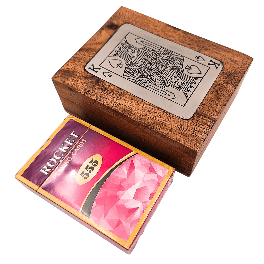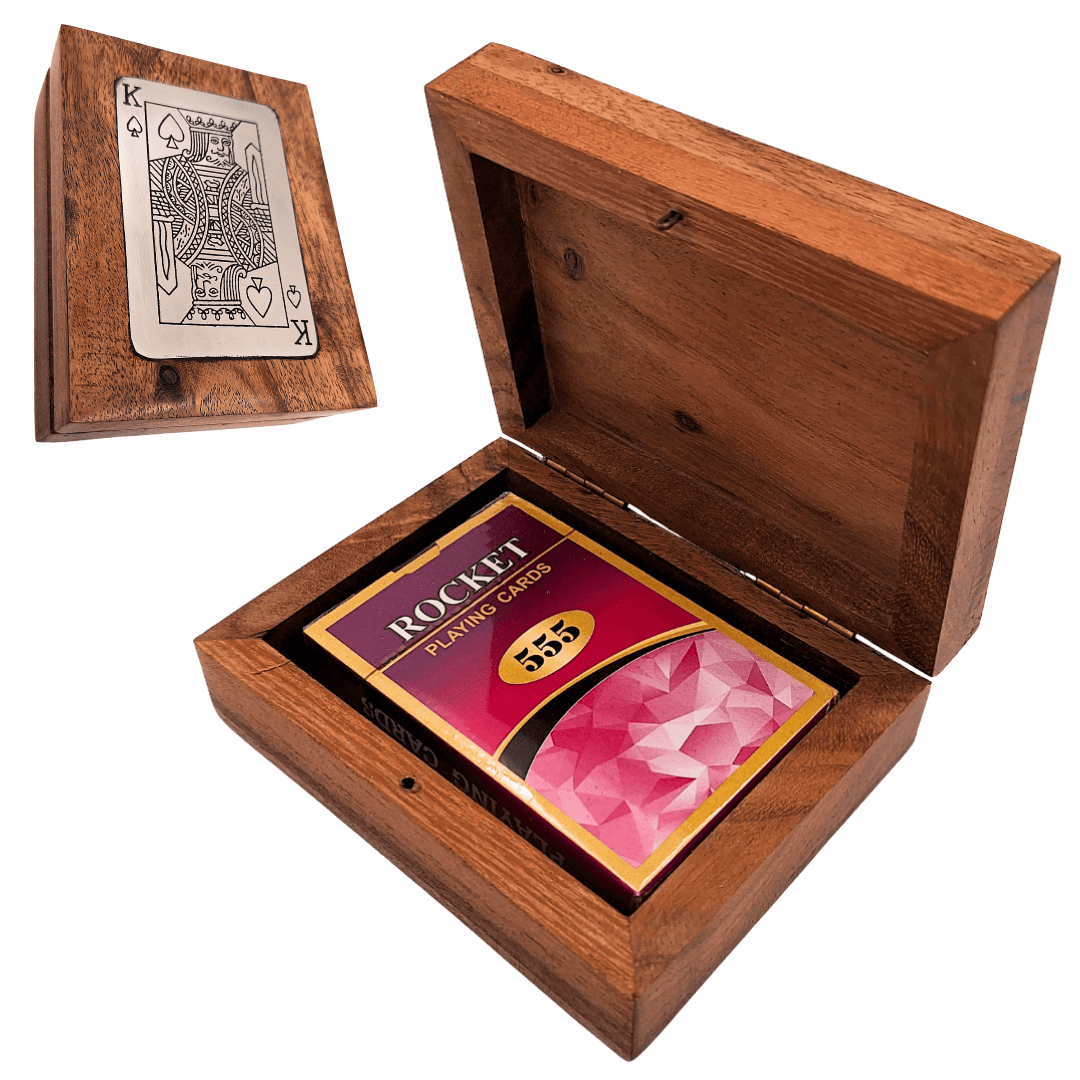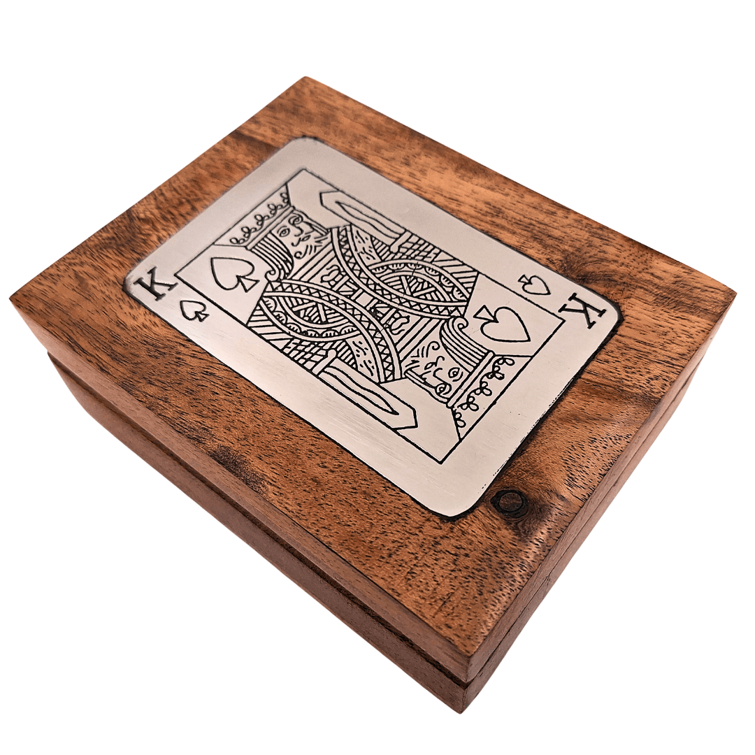 A masszív fadobozba zárt klasszikus kártyapakli azoknak szól, akik értékelik az időtlen szórakozást elegáns környezetben. A természetes fa nemcsak a kártyákat védi, hanem az egésznek egyedi, nemes jelleget is kölcsönöz. Ezt egészíti ki a király képével ellátott alumínium jelvény, amely szemet gyönyörködtető, és a készletet stílusos dísztárgyként jeleníti meg.
