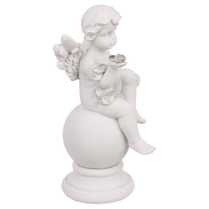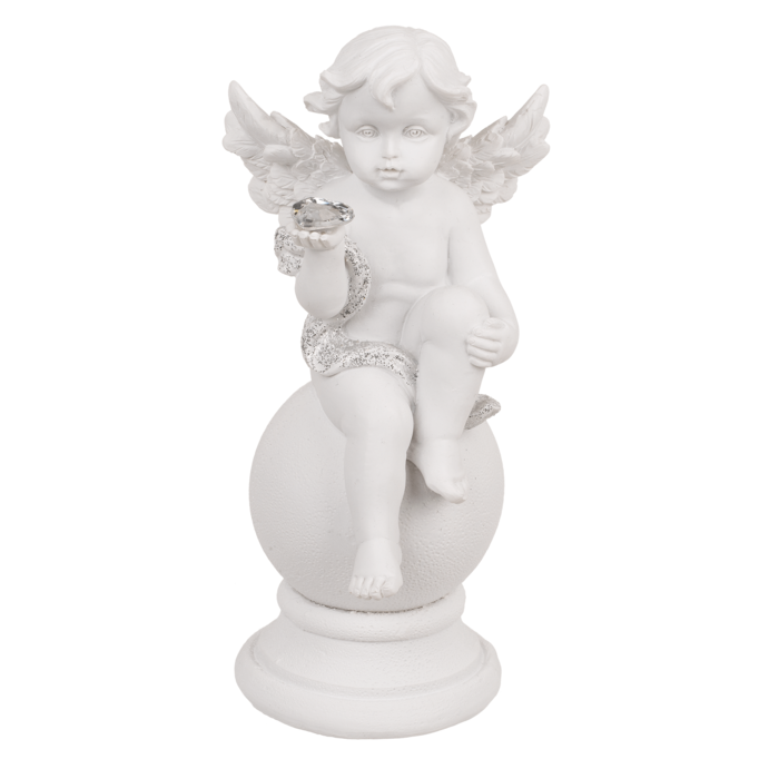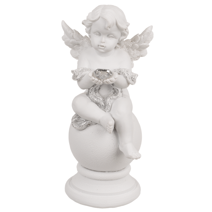 Ця елегантна фігурка ангела, що сидить на кулі з кришталевим серцем, є прикрасою, сповненою чарівності та витонченості. Виготовлена з полімерної смоли, з витонченими прикрасами з парчі, вона захоплює своїми деталями - від крил до блискучого кришталю, який символізує чистоту і любов. Ідеально підходить для класичного, романтичного або святкового інтер'єру. Кожна фігурка має дещо інший вираз обличчя та розташування рук, що робить кожен виріб унікальним. Відправляється випадковим чином у вигляді міксу дизайнів.