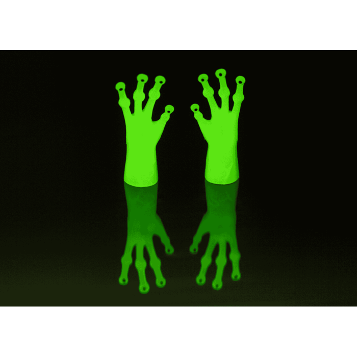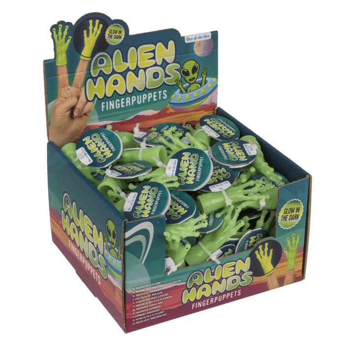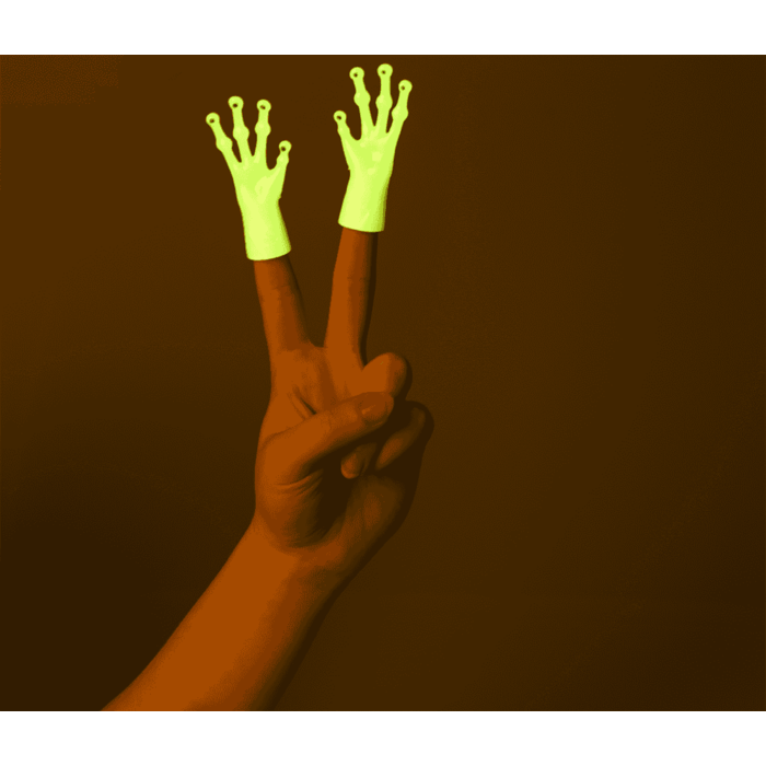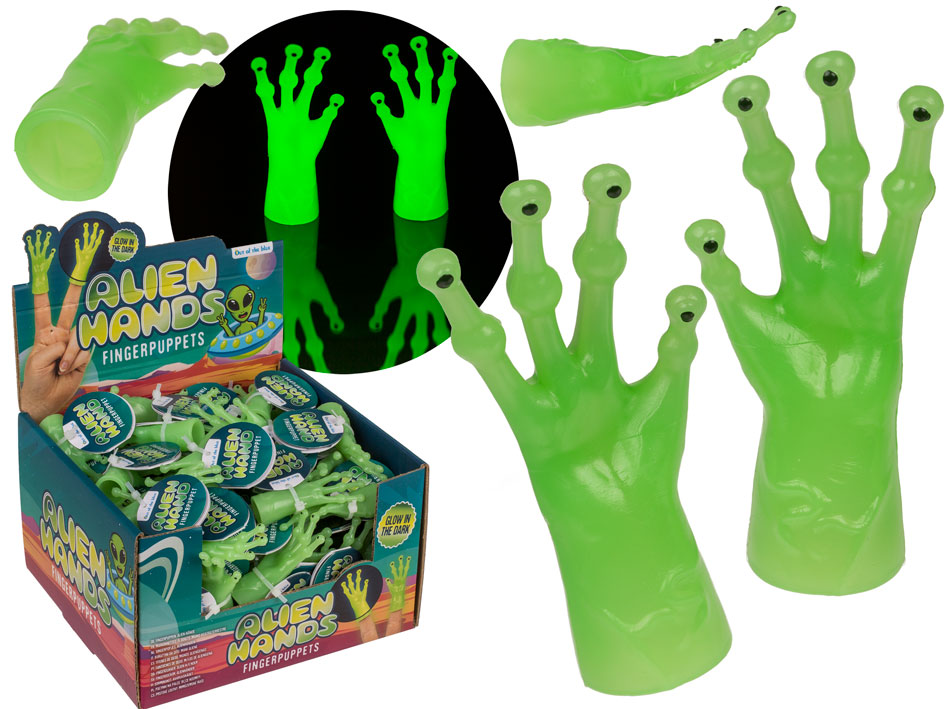 Космічні розваги на кінчиках ваших пальців! Ці зелені руки прибульців, що кріпляться до пальців, як пальчикові ляльки, перенесуть дітей (та й дорослих з фантазією) прямо у фантастичний світ. Ці руки прибульців, що світяться в темряві, додають грі таємничості - просто вимкніть світло, і пальці перетворяться на руки гостей з іншої планети, що світяться. Надзвичайно простий, але цікавий атракціон, який підніме настрій будь-якій компанії та додасть колориту костюмованим святам, вечіркам чи шкільним виставам на Хелловін. Недорога іграшка, а WOW-ефект гарантовано!