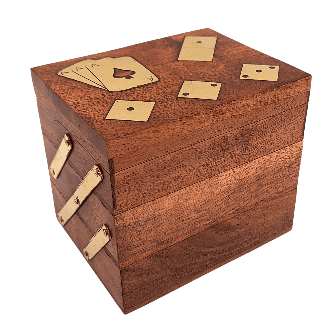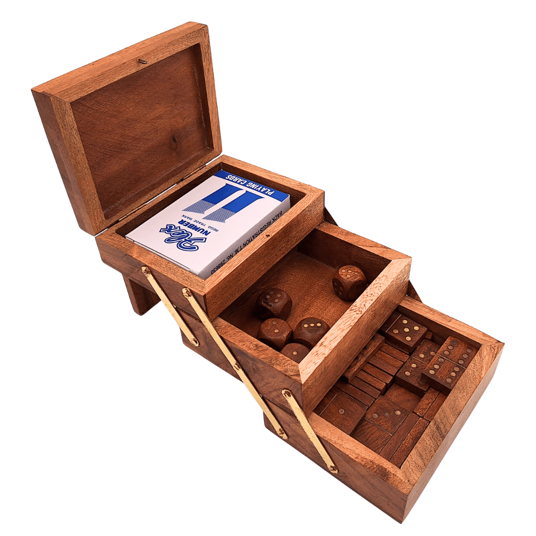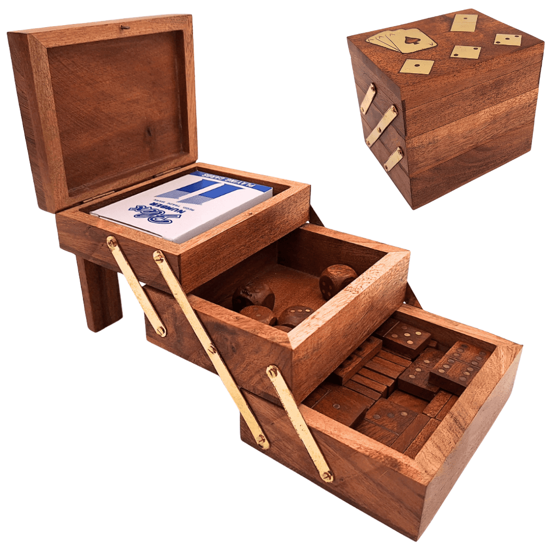 Продумана конструкція з трьома висувними шухлядами гарантує, що кожна гра має власне місце - карти, кубики та доміно завжди впорядковані та готові до використання. У закритому вигляді набір виглядає як елегантний декоративний об'єкт, а в розкладеному - перетворюється на центр домашніх розваг. Поєднання функціональності, естетики та якісної збірки.