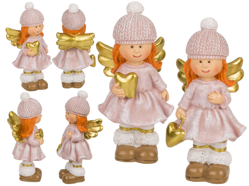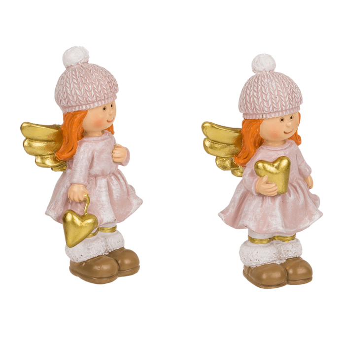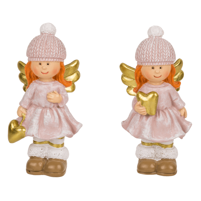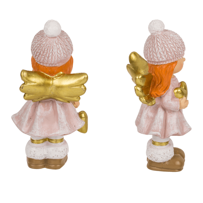 Ніжна фігурка ангела в зимовій шапці із золотим серцем - це унікальна прикраса, яка додасть вашому інтер'єру тепла, спокою та святкового шарму. Виготовлена з полірезини, вона вражає увагою до деталей - від текстури вовняної шапки до мерехтливих золотих крил. Ангел символізує турботу і любов, тому ідеально підходить для подарунка або для прикраси столу, полиці чи підвіконня на Різдво. Доступний у двох дизайнах.