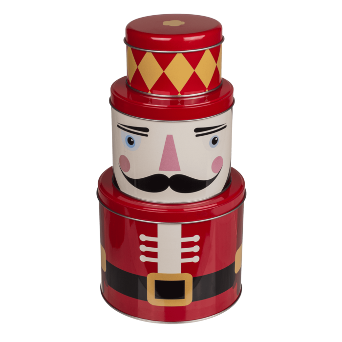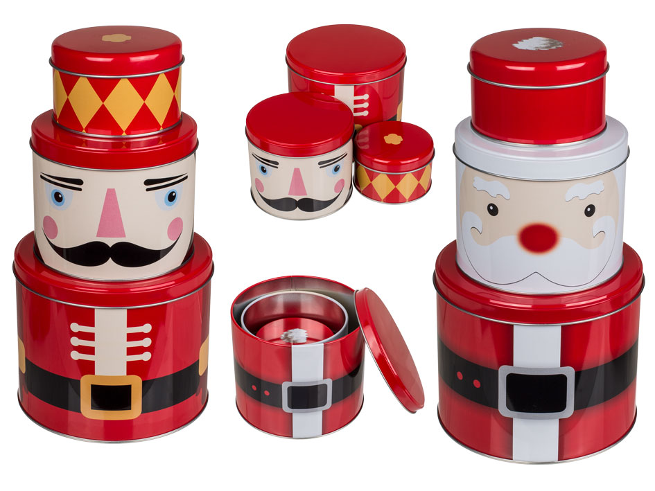 Цей унікальний набір з трьох різдвяних металевих бляшанок у формі персонажів Санти та Лускунчика - ідеальне поєднання практичності та святкового шарму. Кожна бляшанка відрізняється за розміром, тому їх можна складати разом, щоб створити яскраву прикрасу або набір для печива, солодощів та дрібничок. Виготовлені з міцного металу, з красивими кольоровими принтами та глянцевим покриттям. Поставляється у вигляді міксу двох дизайнів.