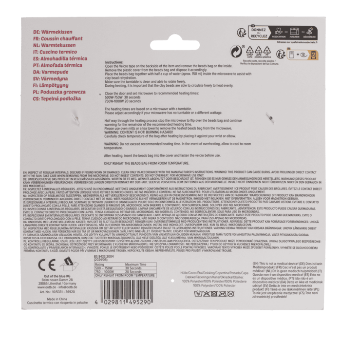 Увага! Регулярно перевіряйте. Зніміть, якщо зношені або пошкоджені! Чистити тільки відповідно до інструкцій виробника. Цей продукт може спричинити опіки. Уникайте тривалого прямого контакту зі шкірою. Будьте обережні, виймаючи з мікрохвильової печі. Не їжте вміст. Не перегрівати. Тільки для використання в мікрохвильовій печі.