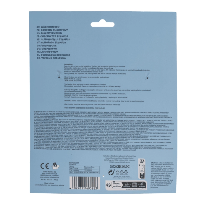 Увага! Регулярно перевіряйте. Зніміть, якщо зношені або пошкоджені! Чистити тільки відповідно до інструкцій виробника. Цей продукт може спричинити опіки. Уникайте тривалого прямого контакту зі шкірою. Будьте обережні, виймаючи з мікрохвильової печі. Не їжте вміст. Не перегрівати. Тільки для використання в мікрохвильовій печі.