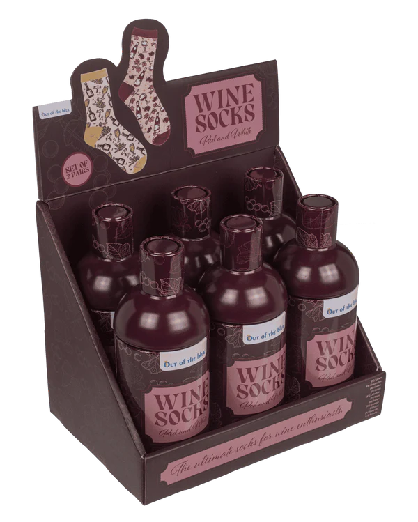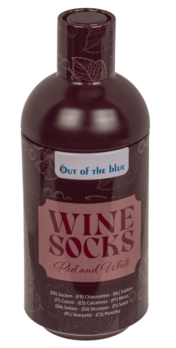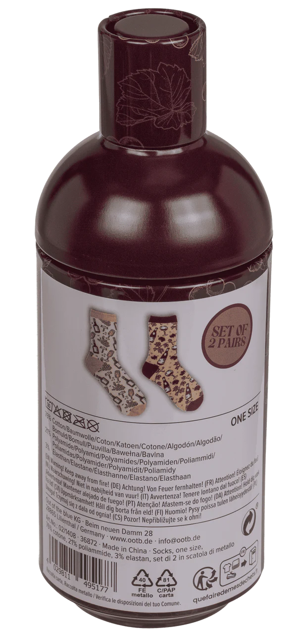 Ці шкарпетки на винну тематику - оригінальний подарунок для людей, які цінують гарний смак - в прямому і переносному сенсі. Витончена графіка пляшок, келихів та винограду надає їм характеру, а весь набір упакований у металеву коробку, стилізовану під винну пляшку, яка миттєво вражає.
