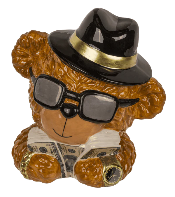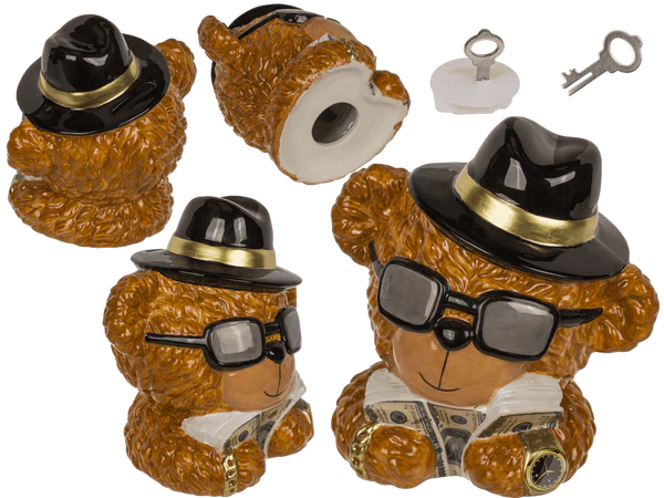 Керамічна скарбничка у вигляді елегантного ведмедика - це унікальне поєднання гумору, стилю та практичності. Ведмедик у капелюсі, окулярах і з банкнотами в лапах виглядає як справжній фінансист - він викликає симпатію і відразу привертає увагу. Це прикраса, яка не тільки прикрашає інтер'єр, але й ефективно спонукає людей відкладати гроші.